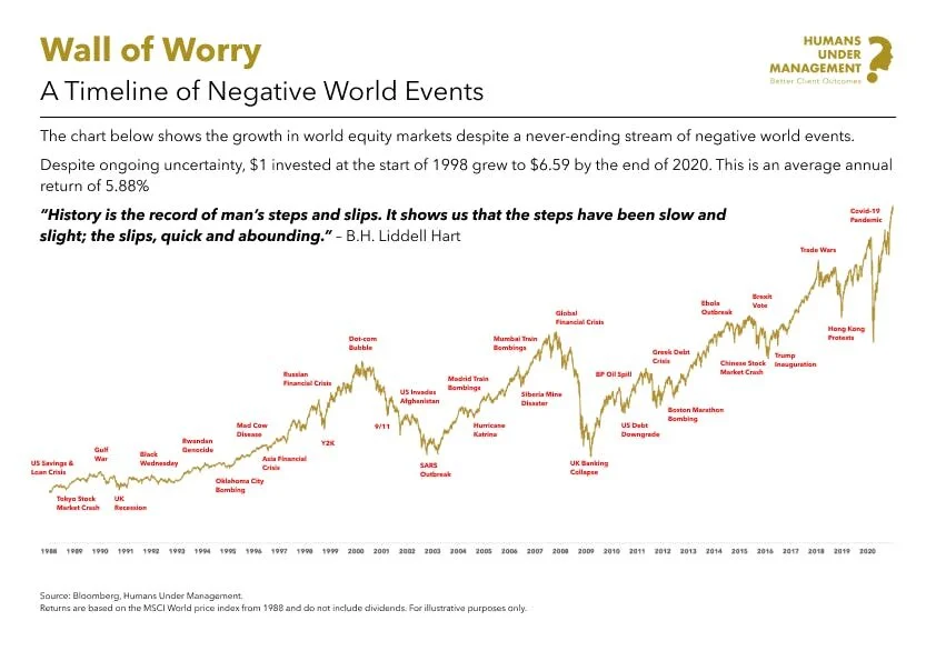2. Study market history. You'll discover that past gains have been in spite of negative events.