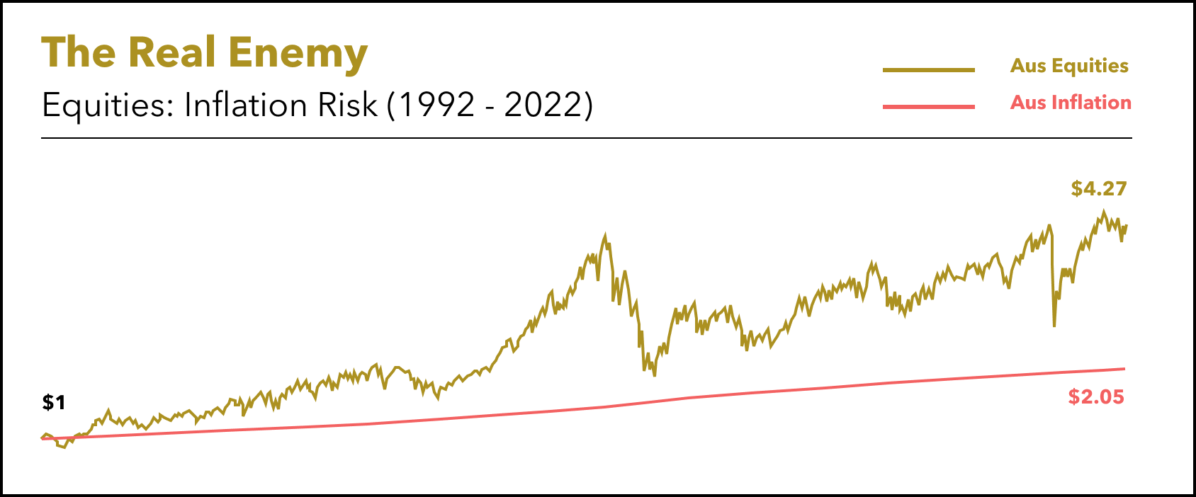Over the last 30 years (about the length of an average two-person retirement), inflation in Australia has resulted in an item costing $1 in 1992 now costing $2.05 in 2022. Your purchasing power has more than halved!