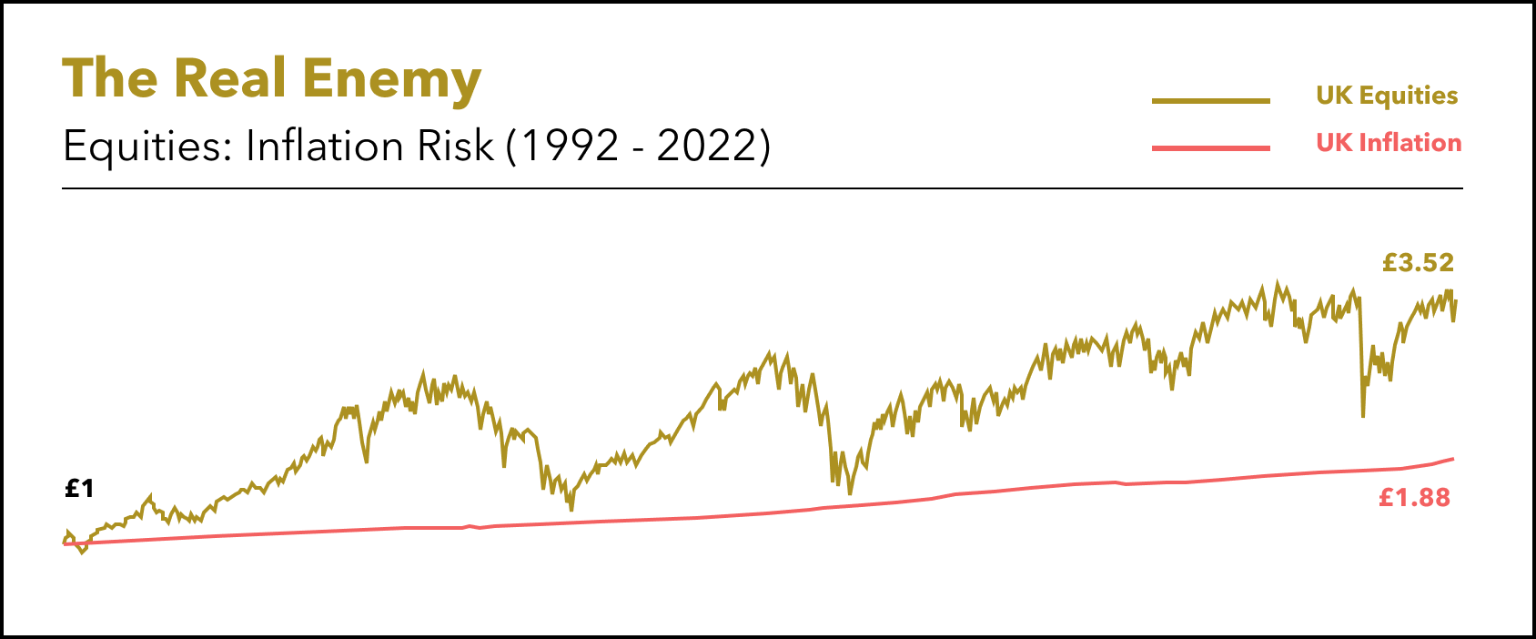 Over the last 30 years (about the length of an average two-person retirement), inflation in the UK has resulted in an item costing Β£1 in 1992 now costing Β£1.88 in 2022. Your purchasing power has almost halved!