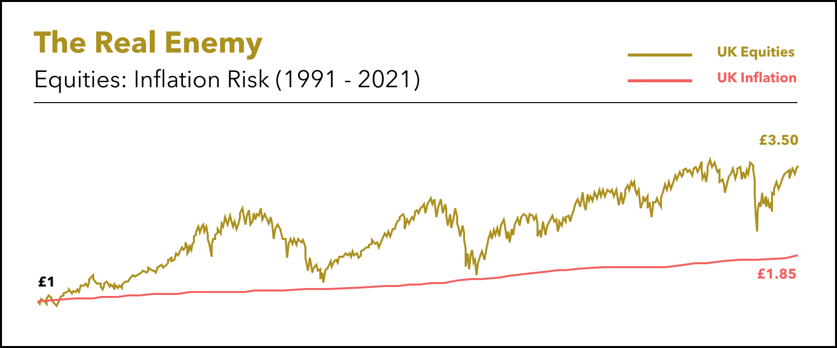 Over the last 30 years (about the length of an average two-person retirement), inflation in the UK has resulted in an item costing Β£1 in 1991 now costing Β£1.85 in 2021. Your purchasing power has almost halved!
