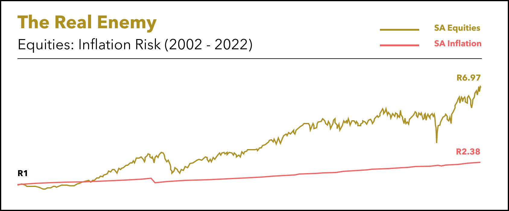 Over the last 20 years, inflation in South Africa has resulted in an item costing R1 in 2002 now costing R2.38 in 2022. Your purchasing power has been decimated!